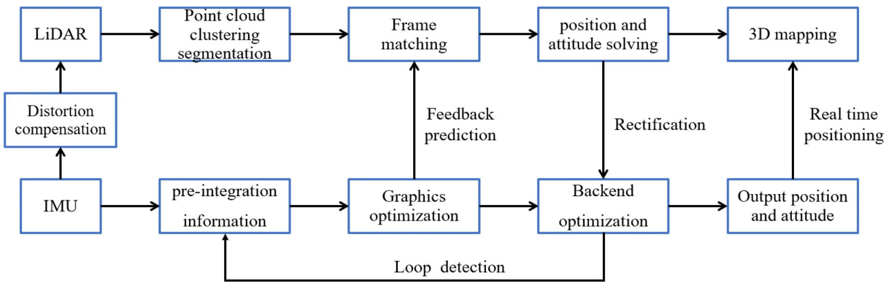Нацеливаясь на проблему, заключающуюся в том, что традиционный алгоритм лазерного SLAM имеет определенный дрейф оценки движения при картографировании больших сцен, что приводит к низкой точности позиционирования и картографирования, в этом исследовании применяется тесно связанный метод одометрии и картографирования с использованием ЛИДАРа и инерциального наведения, основанный на оптимизации графа [ 18 ], и, как на рисунке 10 , процесс делится на следующие этапы: