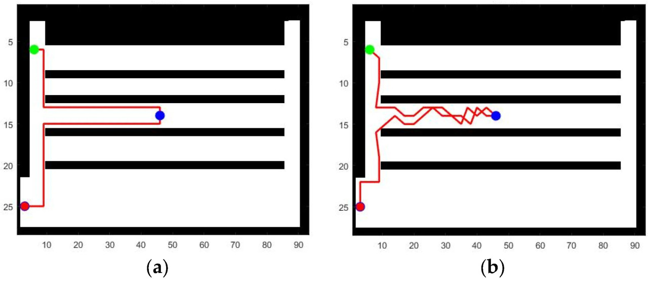 Рисунок 12. Экспериментальные результаты различных алгоритмов планирования пути: ( a ) алгоритм A* и ( b ) алгоритм RRT. Зелёный шар обозначает начальную точку, синий шар — точку остановки, а красный шар — точку разгрузки.