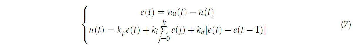 Здесь e ( t ) представляет собой значение отклонения, n 0 ( t ) — желаемое значение, а n ( t ) — текущее фактическое значение; k p , k i и k d представляют собой пропорциональные, интегральные и дифференциальные коэффициенты соответственно;𝑘𝑖=𝑘𝑝⋅ 𝑇𝑇𝐼,𝑘𝑑=𝑘𝑝⋅𝑇𝐷𝑇, а T — период выборки, T I — интегральная постоянная времени, а T D — дифференциальная постоянная времени; e ( t ) представляет систематическое отклонение системы в момент t ; а e ( t − 1) представляет систематическое отклонение системы в момент t − 1.