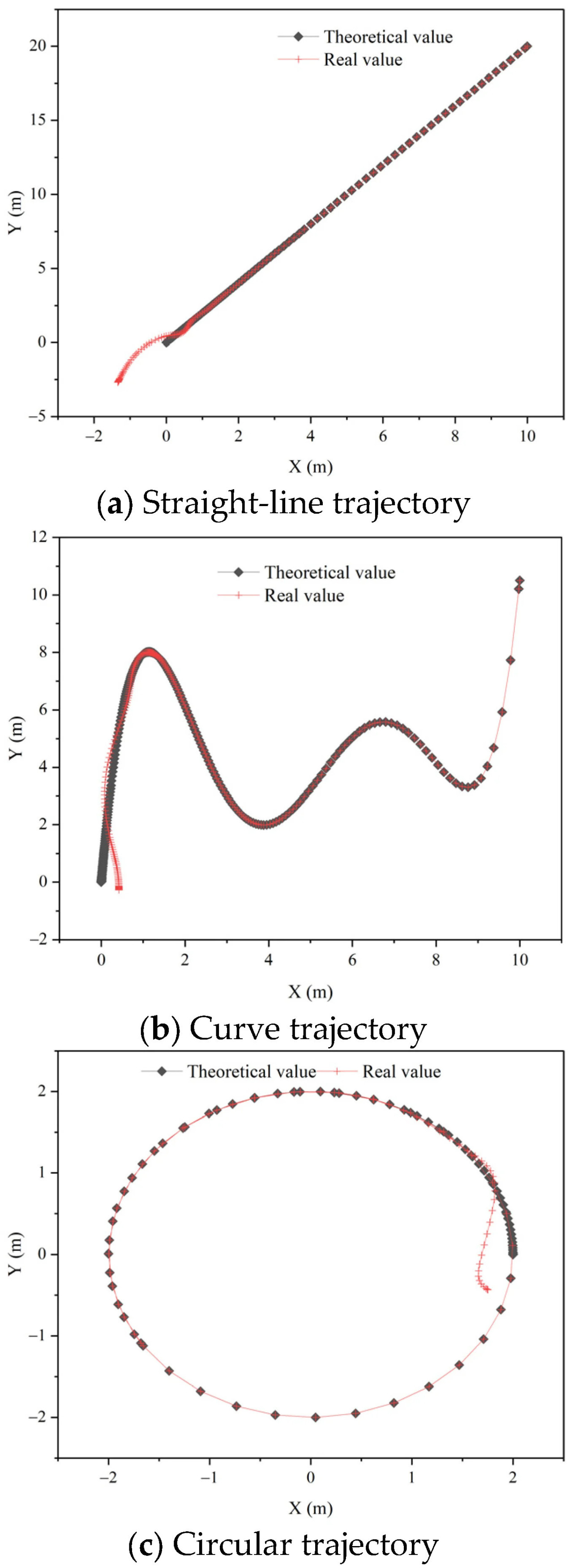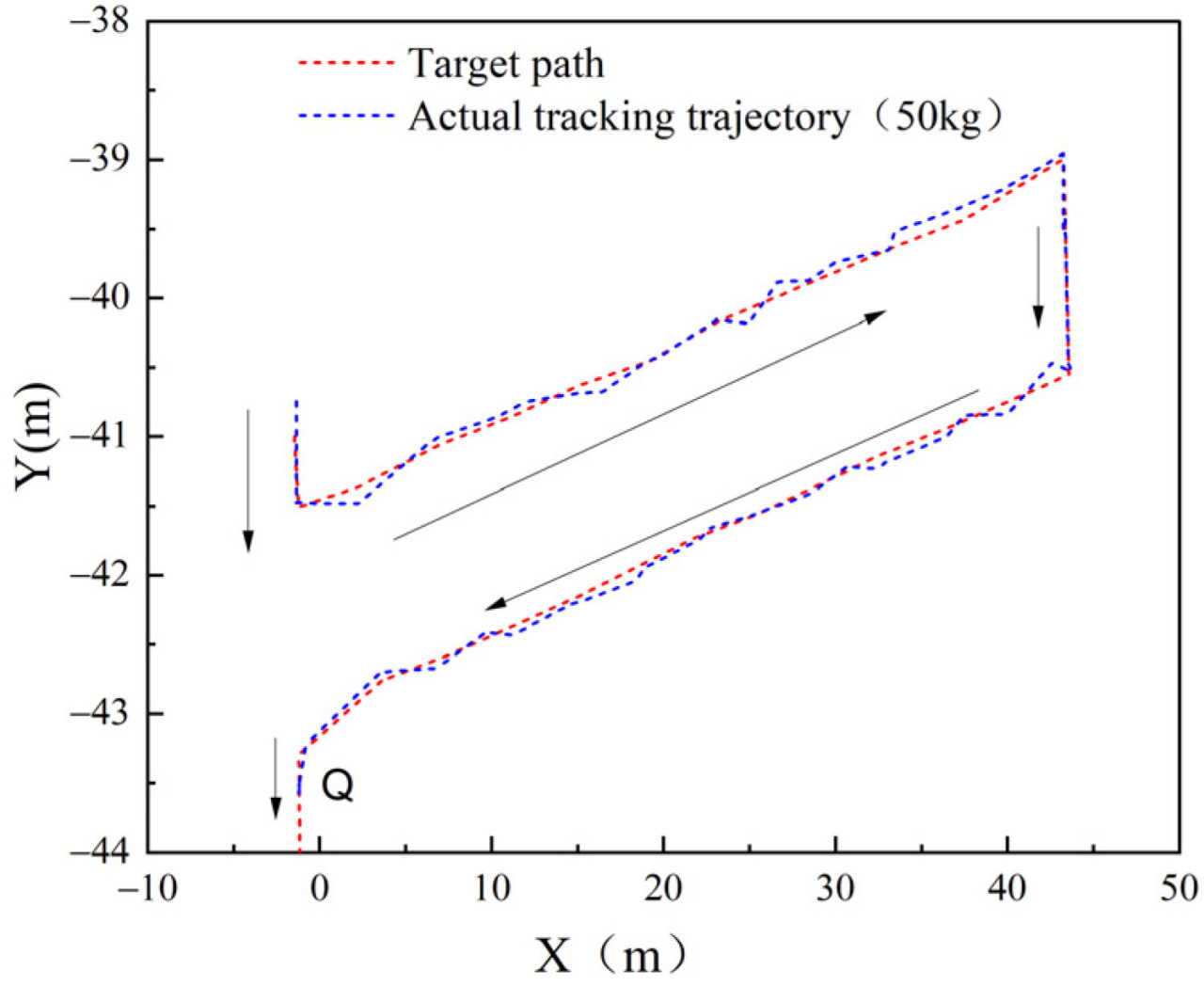 Беспилотный автомобиль был загружен 50, 100 и 150 кг и работал с постоянной скоростью 0,6 м / с для отслеживания пути, а результаты испытаний показаны на рисунке 20. Как видно на рисунке 20 , при различных условиях загрузки фактическая траектория и целевая траектория в основном совпадают, и беспилотный автомобиль может отслеживать целевую траекторию более точно. Наибольшее общее боковое отклонение происходит в рабочей зоне после поворота, что связано с отклонением новой начальной точки от запланированного пути, вызванным поворотом, отклоняющимся на определенное расстояние. К тому времени, когда беспилотный автомобиль определяет предварительное нацеливание после поиска пути, управление ПИД настраивается на отслеживание заданного пути, и ошибка непрерывно уменьшается. Во время движения максимальная ошибка отслеживания пути составила 13,5 см, а среднее значение составило 6,7 см для грузов 50, 100 и 150 кг. Общая ширина колеи беспилотной машины составила 70 см, поэтому общее движение по заданной траектории не отклонялось от заданного пути.