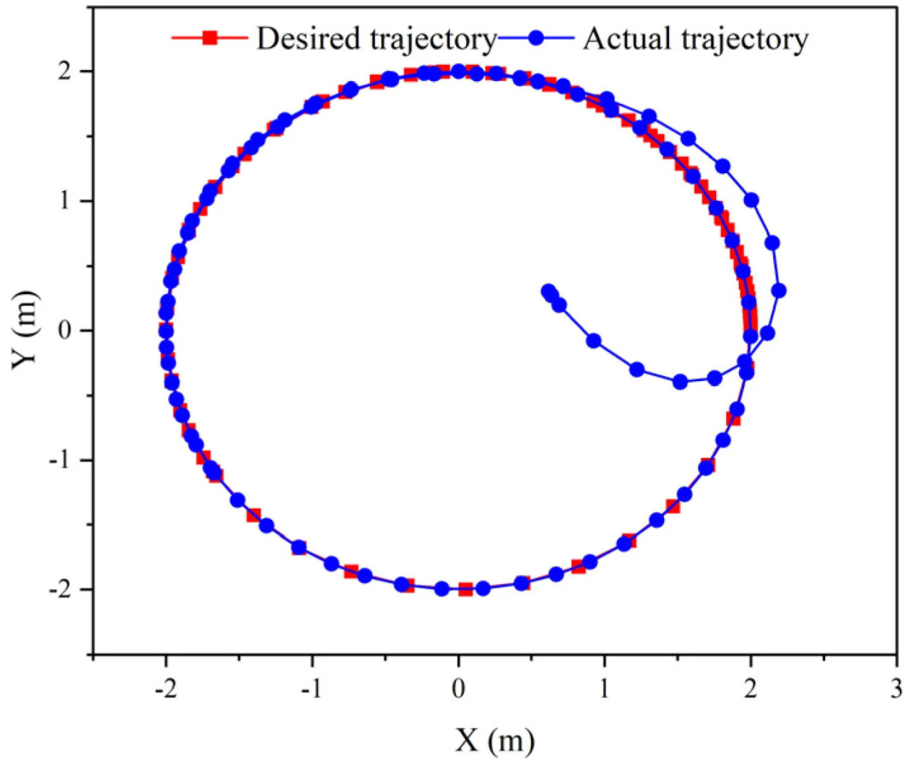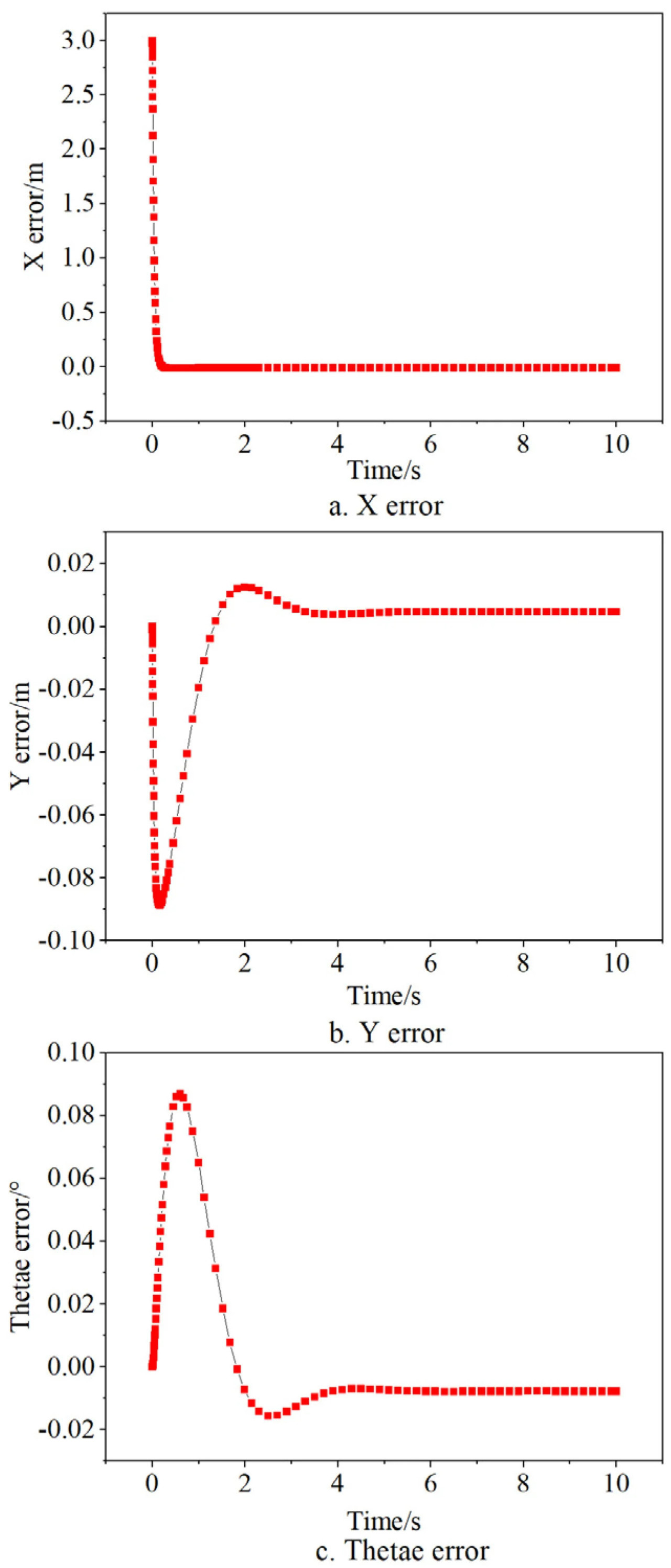 Ошибки x, y и тета как функции времени показаны на рисунке 17. Анализ кривых ошибок показывает, что ошибки системы остаются небольшими и в конечном итоге приближаются к нулю, что указывает на достижение системой идеального отслеживания круговой траектории. Таким образом, система отслеживания траектории с ПИД-регулятором, разработанная в данной статье, демонстрирует превосходную надёжность.