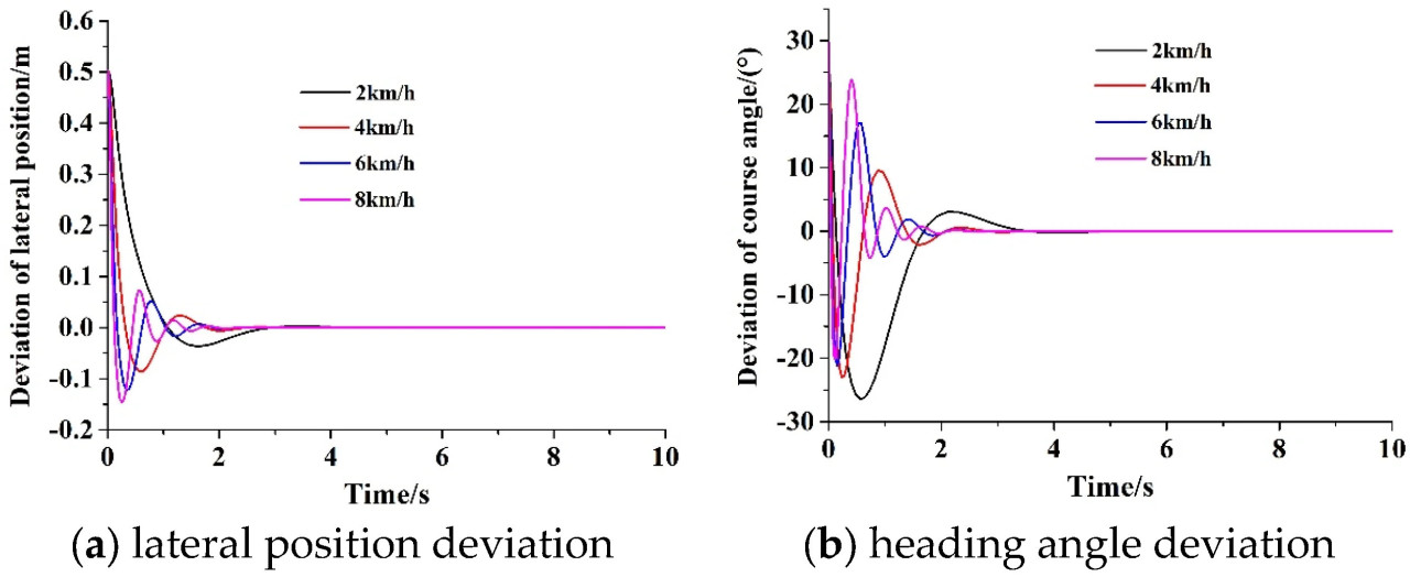 Эффект управления отслеживанием кривой траектории транспортного средства на разных скоростях моделируется, и результаты показаны на рисунке 18. Как видно из рисунка 18 , а, определено большее начальное отклонение в 50 см. При разных скоростных условиях перерегулирование управления отклонением бокового положения существенно не меняется. По мере увеличения скорости время, необходимое для достижения откликом состояния устойчивого состояния, постепенно уменьшается. Наибольшее время, необходимое для достижения устойчивого состояния, составляет около 2,10 с при скорости 2 км/ч. На данный момент начальное отклонение в 50 см было скорректировано до всего лишь 2,3 см. Если отклонение достигает 2,3 см при скорости 8 км/ч, это занимает всего 0,92 с. Как видно из рисунка 18 б, при заданном начальном отклонении в 30° перерегулирование управления отклонением угла курса существенно различается при разных скоростных условиях. С увеличением скорости перерегулирование значительно уменьшается, а время достижения устойчивого состояния около 5° сокращается. Время достижения устойчивого состояния на низкой скорости 2 км/ч и высокой скорости 8 км/ч составляет 1,6 и 0,59 с соответственно. Это свидетельствует о том, что разработанный ПИД-регулятор обладает хорошим адаптивным эффектом управления к интерференции факторов скорости и способен обеспечить быстрое и устойчивое управление.