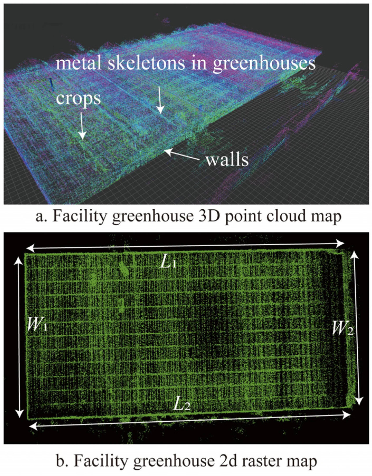 В последние годы новые технологии, такие как 5G, большие данные, искусственный интеллект, навигация Beidou и распознавание изображений, быстро прогрессируют, и они интегрируются и применяются в исследованиях и разработках сельскохозяйственной техники [ 10 , 11 ]. Передовые технологии не только повышают эффективность работы и точность сельскохозяйственной техники, но и снижают производственные затраты. В частности, в последние годы применение беспилотной технологии постепенно демонстрировалось на таких культурах, как рис, пшеница, хлопок, сады и овощи открытого грунта, что делает беспилотные фермы реальностью [ 12 , 13 ]. Однако из-за таких факторов, как стальной каркас теплицы и покрытие культур, существуют проблемы с помехами и потерей сигнала сети. Это приводит к большим ошибкам в навигации и точности позиционирования, что привело к медленному прогрессу беспилотного производства в теплицах. Чтобы улучшить интеллектуальную автономность транспортных средств, ученые провели ряд исследований. Ши Юндао и др. спроектировали шасси опрыскивателя на основе визуальной навигации, которое может гибко поворачиваться и ходить автономно [ 14 ]; Нху Туонг Ан Нгуен и др. использовали машинное зрение для автономной навигации опрыскивателя для томатов и использовали визуальный алгоритм для определения плотности листьев томатных растений, чтобы можно было применять пестициды по мере необходимости [ 15 ]; Ли и др. обнаружили, что с помощью высокоточных геомагнитных датчиков и телеобъективов с высоким разрешением можно дополнительно повысить точность навигации транспортных средств для теплиц с большой аркой [ 16 ]; а Кенан Лю и др. разработали автономную навигационную систему для робота по сбору томатов в теплице на основе лазера SLAM, который показал хорошую точность позиционирования как при прямолинейном движении, так и при поворотах в проходах шириной 80 см [ 17 ].