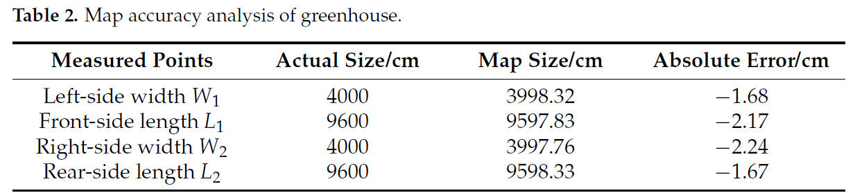 Общая площадь теплицы составляет около 3800 м², она прямоугольная, длиной 96 м и шириной 40 м. Были измерены размеры сетки теплицы и сопоставлены с фактическими данными. Результаты представлены в таблице 2. Максимальное отклонение между фактическими размерами и размерами сетки составило 2,24 см, минимальное – 1,67 см, а среднее – 1,94 см. Отклонения соответствуют индексу картографирования автономной навигационной системы. При этом значения отклонений очень близки, что подтверждает устойчивость алгоритма LeGO_LOAM.