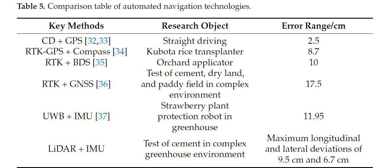 Как показано в Таблице 5 , спутниковые системы позиционирования, такие как GPS и BDS, обеспечивают точное абсолютное позиционирование для беспилотных сельскохозяйственных транспортных средств или сельскохозяйственных роботов с ошибками позиционирования в пределах 2,5 см [ 32 , 33 ]. Чжан и др. [ 34 ] сосредоточили свои исследования на рисовой рассадопосадочной машине от Kubota, используя систему кинематического глобального позиционирования в реальном времени (RTK-GPS) и технологию электронного компаса для точного позиционирования. Их работа достигла автоматического управления рассадопосадочной машиной как по криволинейным, так и по прямым траекториям, с максимальным зарегистрированным боковым отклонением менее 8,7 см, когда рассадопосадочная машина двигалась со скоростью 0,33 м/с. Сюн [ 35 ] использовал метод позиционирования RTK-BDS на основе спутниковой навигационной системы Beidou для реализации автоматической навигации и операции распыления аппликатора пестицидов для сада. Тем временем, Лю и др. [ 36 ] интегрировали технологию RTK-GNSS в автоматическую навигационную систему опрыскивателя ZP9500, проведя комплексные испытания в различных условиях, включая цементные поля, сухие поля и рисовые поля. В особенно сложных условиях эксплуатации рисового поля система продемонстрировала максимальное боковое отклонение 17,5 см, продемонстрировав устойчивость и адаптивность технологии в сложных сельскохозяйственных условиях.