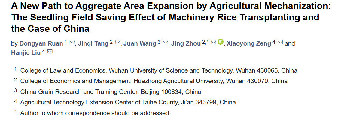 Перевод статьи «A New Path to Aggregate Area Expansion by Agricultural Mechanization: The Seedling Field Saving Effect of Machinery Rice Transplanting and the Case of China» авторов Ruan D, Tang J, Wang J, Zhou J, Zeng X, Liu H., оригинал доступен по ссылке. Лицензия: CC BY. Изменения: переведено на русский язык