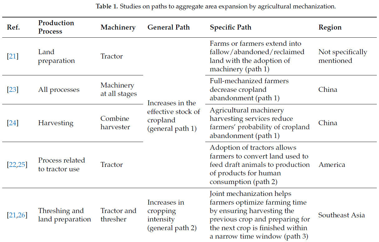 Предыдущие исследования выявили три конкретных и два общих пути механизации сельского хозяйства для увеличения совокупной площади [ 21 , 22 , 23 , 24 , 25 , 26 ]. Первый общий путь - это увеличение эффективного фонда пахотных земель, который включает два конкретных пути, а именно, фермы или фермеры, расширяющие залежные/заброшенные/мелиорированные земли, и фермеры, переводящие земли, используемые для корма рабочего скота, в производство продуктов для потребления человеком. Второй общий путь - это увеличение интенсивности земледелия, и он охватывает третий конкретный путь, а именно, фермеры, оптимизирующие время земледелия путем своевременного завершения сбора предыдущего урожая и подготовки к следующему урожаю в течение узкого временного окна.