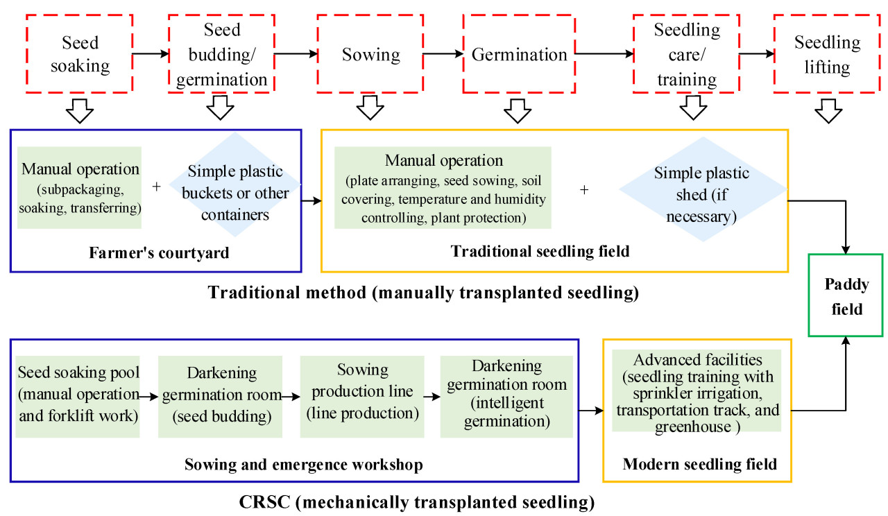 Техническое различие между двумя методами выращивания рассады риса заключается в основном в типах рассады, этапах выращивания рассады, сфере производственной деятельности, помещениях и оборудовании, а также конкретной технологии выращивания рассады (см. рисунок 2 ).