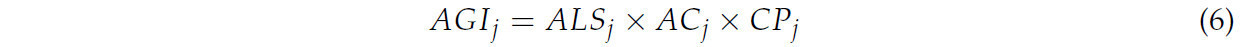 где 𝐴 𝐺 𝐼𝑗 представляет собой увеличенную суммарную площадь. 𝐴 𝐶𝑗 представляет собой коэффициент корректировки земельных угодий для j-го типа риса, то есть, учитывающий, исключают ли мероприятия по выращиванию рассады в текущем сезоне возможность выращивания потенциального предшественника. Для раннего риса 𝐴 𝐶𝑗= 0 (участки обычно находятся под зимним паром перед посадкой раннего риса), а также для риса среднего и позднего сроков созревания, 𝐴 𝐶𝑗= 1 (теоретически на участках можно высаживать другие культуры до риса текущего сезона). 𝐶 𝑃𝑗представляет собой ожидаемое направление структуры посевов на сохраненном традиционном рассадном участке, когда он больше не будет использоваться для выращивания рассады риса. 𝐶 𝑃𝑗 равен 0, если ожидаемая схема возделывания — монокультура, и равен 1 для севооборота. Расширение производственных мощностей CRSC можно выразить как