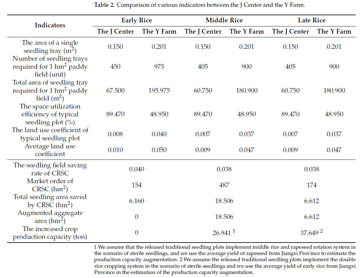 На основе данных опроса J-центра и Y-фермы в этой статье оценивается совокупный эффект расширения площади CRSC в J-центре. Таблица 2 показывает, что количество рассадных лотков, необходимых на единицу рисового поля в J-центре, более чем вдвое меньше, чем на Y-ферме, что приводит к значительному повышению эффективности поставок рассады. Для раннего риса общая площадь рассадных лотков, необходимых на гектар рисового поля в J-центре, составляет всего 67,5 м² , что составляет одну треть от показателя Y-фермы. Для среднеспелого и позднего риса этот показатель в J-центре снижается до 60,75 м² , тогда как на Y-ферме он достигает 180,90 м² . По сравнению с традиционным методом CRSC повышает эффективность поставок рассады на 2/3.