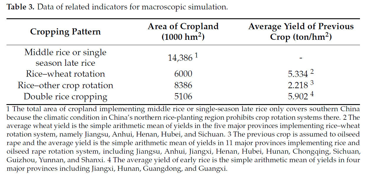 Одним из основных показателей, необходимых для прогнозирования и моделирования эффекта расширения макросовокупной площади MRT и CRSC, является площадь пахотных земель, на которых реализуются различные схемы земледелия. К этим схемам относятся, среди прочего, системы севооборота рис-пшеница, системы севооборота рис-другая культура (включая масличный рапс) и двойной урожай риса. Предыдущее исследование показывает, что площадь пахотных земель, на которых реализуется система севооборота рис-пшеница в Китае, составляет приблизительно 6 миллионов гектаров [ 27 ]. Эти пахотные земли в основном сосредоточены в таких провинциях, как Цзянсу, Аньхой, Хубэй, Сычуань и Хэнань. Согласно данным, представленным в Китайском статистическом ежегоднике по сельским районам, площадь пахотных земель, на которых реализуется непрерывный посев двухсезонного риса в Китае в 2022 году, составляла 5,1 миллиона гектаров, в основном сосредоточенных в провинциях Цзянси, Хунань, Гуандун и Гуанси.