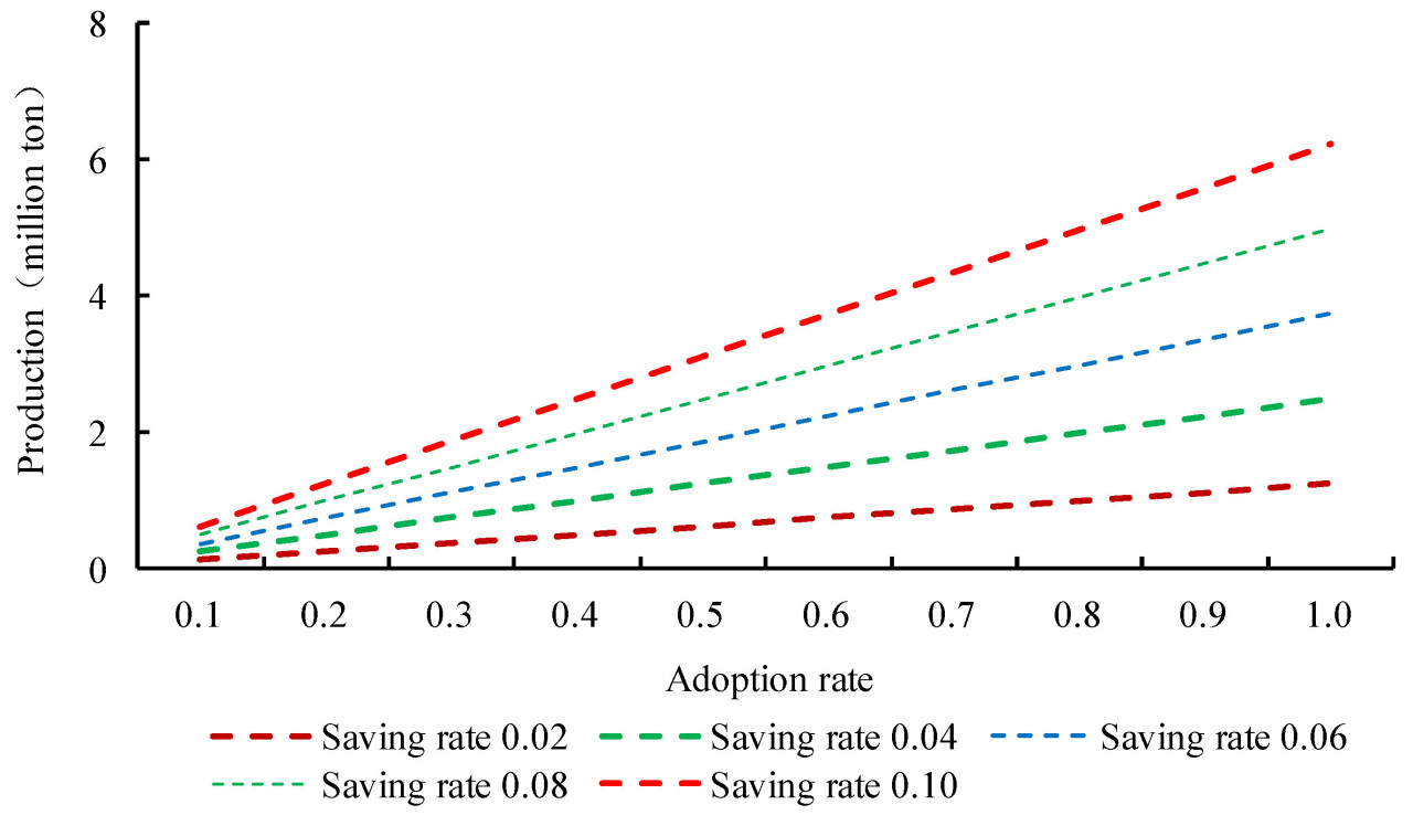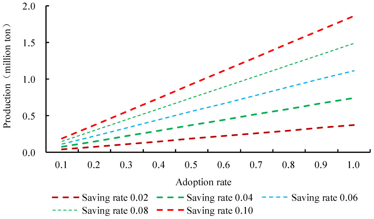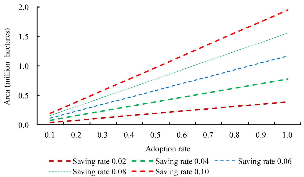 Мы можем просто смоделировать эффект расширения совокупной площади MRT и CRSC, последовательно изменяя значения двух ключевых показателей на национальном уровне. Это показатель экономии посевных площадей и показатель внедрения технологии MRT (равный доле рисовых полей, обслуживаемых CRSC). Последний показатель варьируется от 0 до 1, и чем больше значение, тем выше показатель внедрения. Для моделирования эффекта расширения совокупной площади при заданной системе посадки мы используем следующую формулу: