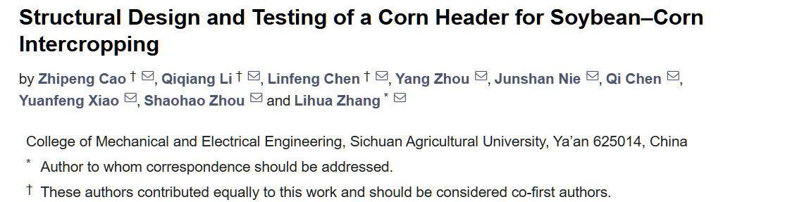 Cao Z, Li Q, Chen L, Zhou Y, Nie J, Chen Q, Xiao Y, Zhou S, Zhang L. Structural Design and Testing of a Corn Header for Soybean–Corn Intercropping. Agriculture. 2025; 15(2):123. https://doi.org/10.3390/agriculture15020123