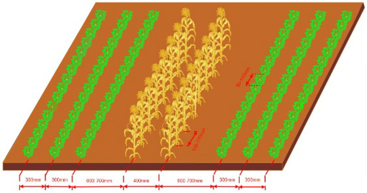 При полосном способе посева междурядий кукурузы составляет 400 мм, расстояние между растениями – 100–170 мм, а расстояние между полосами кукурузы и сои – 600–700 мм [ 13 ], как показано на рисунке 2 .