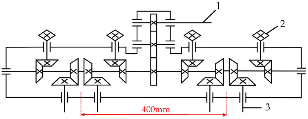 Редуктор початкоотделителя, являясь неотъемлемым компонентом устройства початкоотделения кукурузной жатки, по сути работает путем распределения входной мощности на набор вращающихся в противоположных направлениях звездочек зерна и набор вращающихся в противоположных направлениях муфт привода стеблей [ 14 ]. Междурядье кукурузной жатки представляет собой расстояние между центральными плоскостями двух соседних редукторов початкоотделителя. Когда установочные положения двух редукторов соприкасаются, междурядье кукурузной жатки минимизируется. Однако из-за большого размера существующих редукторов початкоотделителя, даже при соприкосновении двух редукторов, междурядье кукурузной жатки по-прежнему превышает 400 мм, что не соответствует требованиям рядовой уборки. Чтобы решить эту проблему, исходная трансмиссия редуктора упрощается, и два редуктора двухрядной кукурузной жатки объединяются в один большой редуктор для достижения проектной цели - междурядья 400 мм, как показано на рисунке 3 .