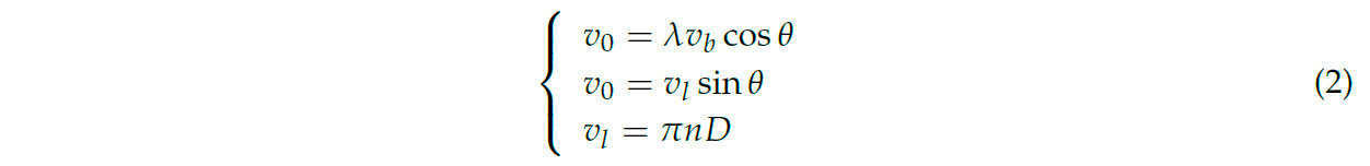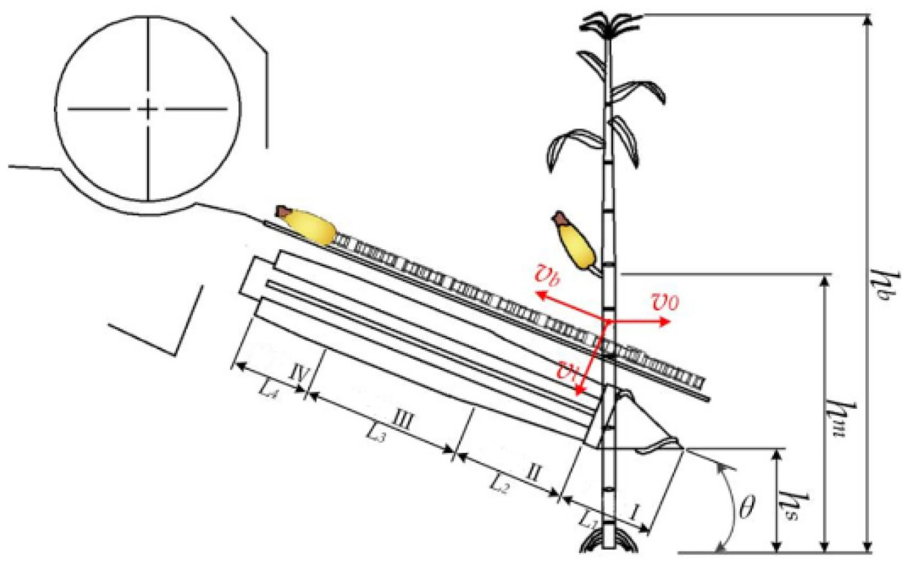 Во время операции по сбору початков кукурузной жаткой положение стеблей связано со скоростью движения комбайна, линейной скоростью вальцов стеблей и линейной скоростью зерновых цепей. Слишком большое или слишком малое отношение линейной скорости зерновой цепи v b к линейной скорости вальца стебля v l может повлиять на качество работы кукурузной жатки [ 17 , 18 , 19 , 20 ]. В идеальном состоянии во время фазы подачи стеблей горизонтальная составляющая линейной скорости зерновой цепи v b должна быть равна по величине, но противоположна по направлению скорости движения комбайна v 0 ; во время фазы вытягивания стеблей горизонтальная составляющая линейной скорости вальца стебля v l должна быть равна по величине, но противоположна по направлению скорости движения комбайна v 0 . В это время стебли кукурузы остаются в вертикальном положении, что обеспечивает высококачественную операцию по сбору початков.