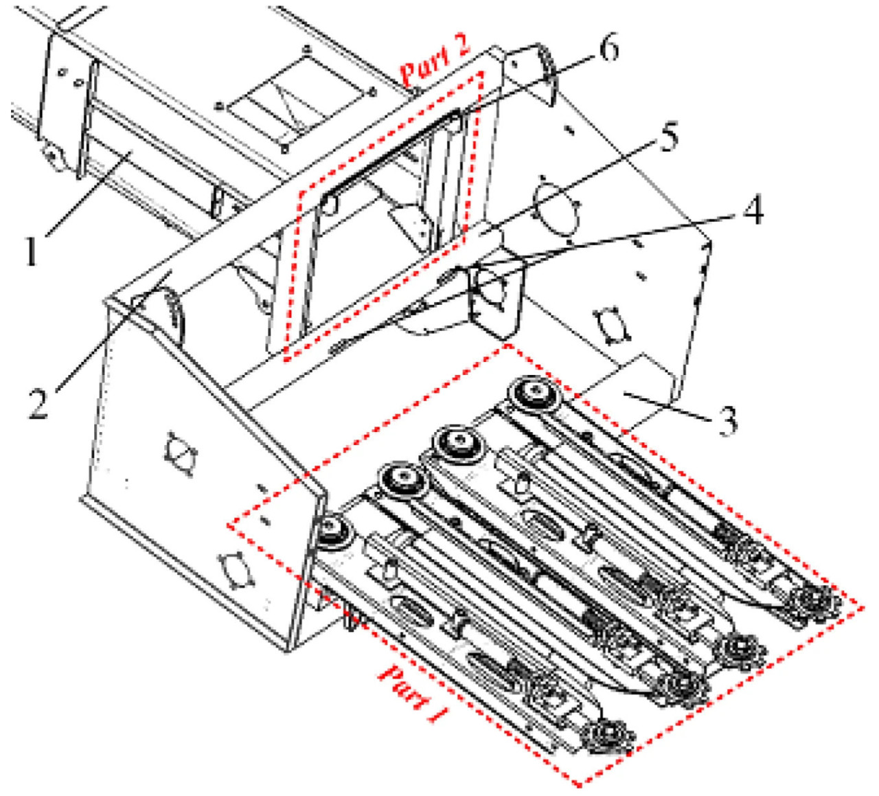Рама кукурузоуборочной жатки является важнейшим компонентом жатки и отвечает за поддержку ключевых элементов, таких как редуктор початкоотделителя, стеблеподающие ролики и шнек, а также за соединение с наклонной камерой [ 22 ], как показано на рисунке 5. Соединение между кукурузоуборочной жаткой и наклонной камерой осуществляется путем установки верхней поперечной балки рамы жатки в соединительный паз на конце наклонной камеры, в то время как нижняя поперечная балка рамы кукурузоуборочной жатки надежно прикреплена болтами к наклонной камере.