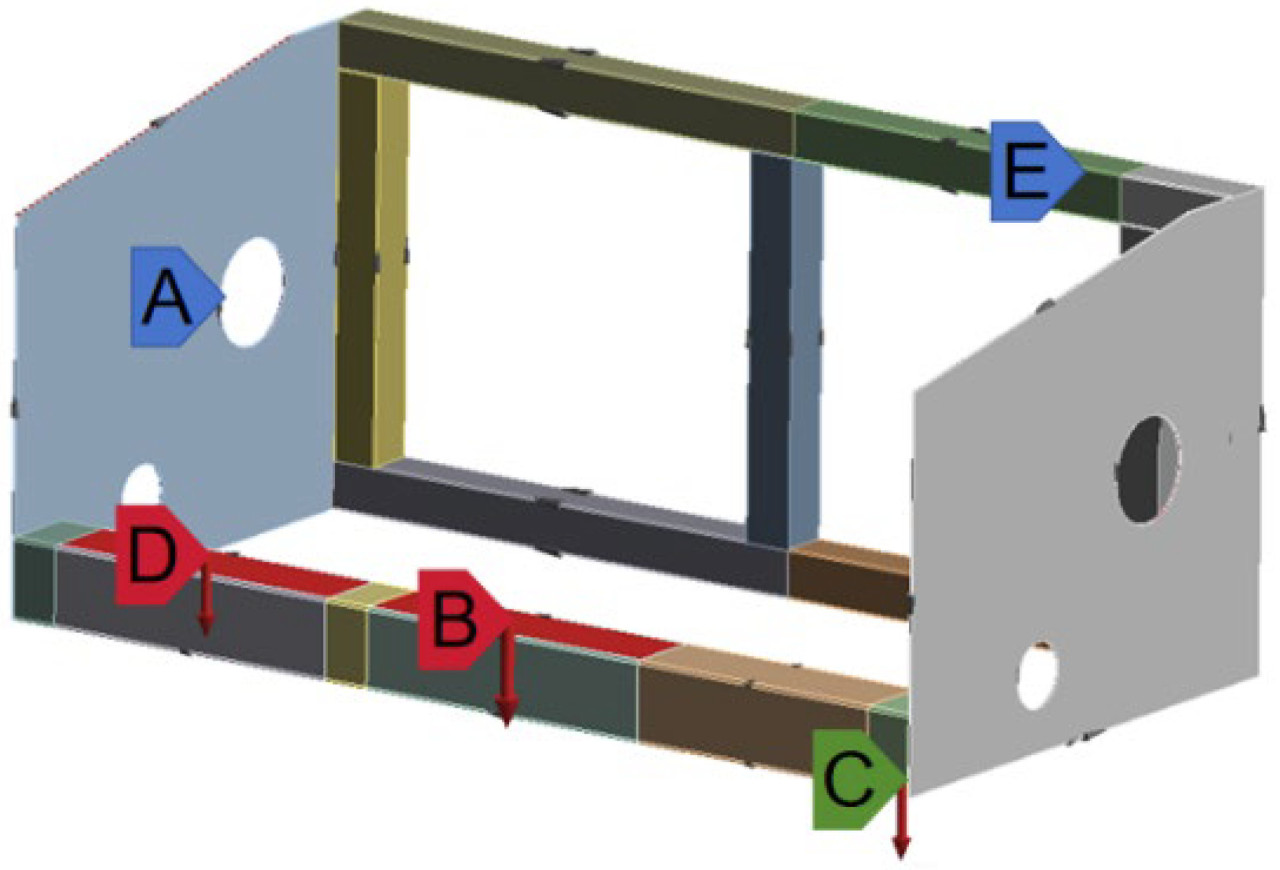 Распределение нагрузки показано на рисунке 7. В точке A, где боковая панель жатки соприкасается со шнеком, приложена сосредоточенная нагрузка; в точке B, где боковая панель жатки также соприкасается со шнеком, приложена распределённая нагрузка; в точке C, где боковая панель кукурузной жатки соприкасается со спиральным транспортёром, приложена сосредоточенная нагрузка; в точке D, где установлен измельчающий аппарат, приложена растягивающая нагрузка; в точке E к передней поперечине рамы кукурузной жатки приложена растягивающая нагрузка. Собственный вес рамы кукурузной жатки учитывается путём установки ускорения свободного падения, направленного вниз, равным 9,8 м/с².