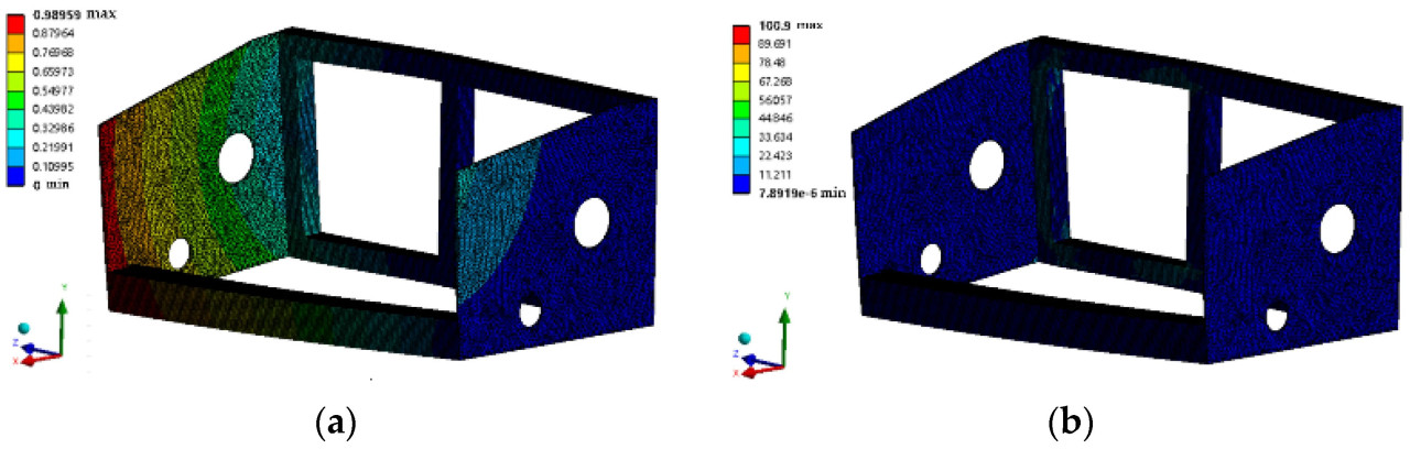 Рисунок 8. Результаты статического анализа рамы кукурузной жатки. ( а ) Общая деформация рамы кукурузной жатки; ( б ) эквивалентное напряжение в раме кукурузной жатки.