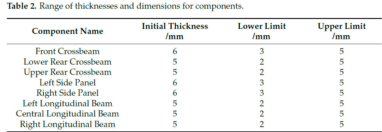 Для повышения безопасности эксплуатации комбайна и снижения веса кукурузоуборочной жатки в качестве конструктивных переменных были выбраны восемь размеров: толщина передней поперечины, нижней задней поперечины, верхней задней поперечины, левой боковой панели, правой боковой панели, левой продольной балки, центральной продольной балки и правой продольной балки. Диапазон толщин и размеров каждого компонента представлен в таблице 2 .