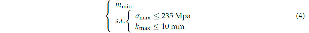Целью оптимизации было минимизировать массу рамы кукурузной жатки, при этом ограничениями служили максимальное эквивалентное напряжение и полная деформация. В качестве проектных переменных использовались восемь размеров толщины компонентов, математически описанных следующим образом: