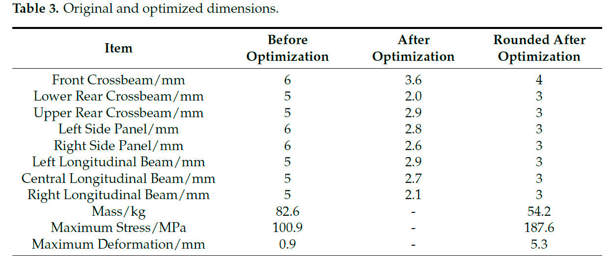 Результаты оптимизации представлены в таблице 3. В соответствии со спецификациями стали, доступной на рынке, оптимизированные данные были округлены, а конечно-элементная модель соответствующим образом изменена. Максимальное эквивалентное напряжение рамы кукурузоуборочной жатки составило 187,6 МПа, а максимальная деформация – 5,3 мм. Оптимизированная масса составила 54,2 кг, что соответствует снижению массы на 34,2%, что свидетельствует о значительном снижении веса.