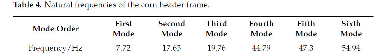 (2) Для статических расчётов разработанной рамы кукурузоуборочной жатки использовалось программное обеспечение для конечных элементов, что выявило значительный потенциал оптимизации. Для снижения общей массы кукурузоуборочного комбайна были оптимизированы размеры рамы, что привело к снижению веса на 28,4 кг. Результаты расчётных модальных расчётов были сопоставлены с экспериментальными модальными результатами, что подтвердило эффективность статических расчётов для лёгкой рамы кукурузоуборочной жатки и предоставило ориентир для реальных производственных условий.