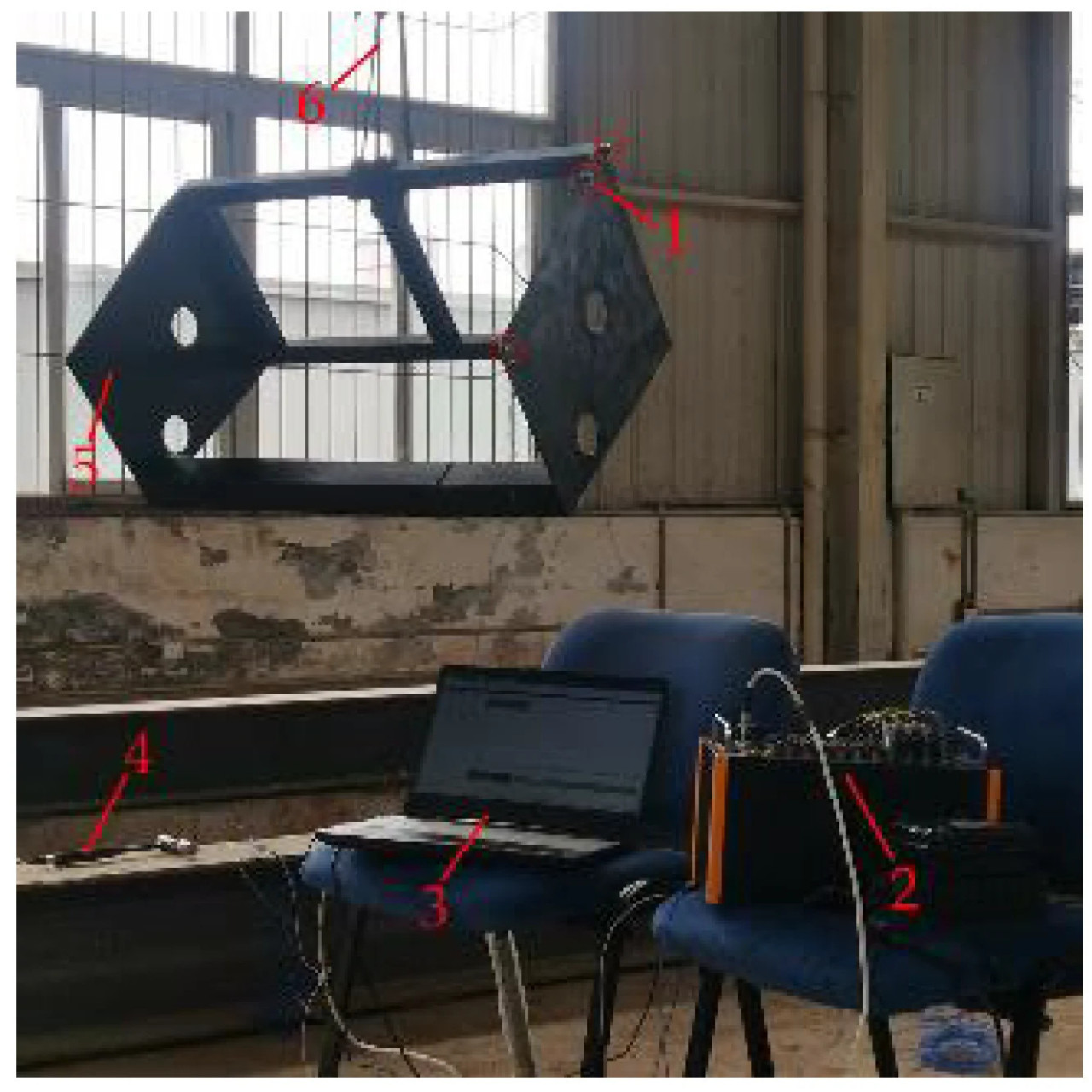 Рисунок 10. Место проведения модального эксперимента. (1) Акселерометр; (2) устройство сбора данных; (3) компьютер; (4) ударный молоток; (5) рама кукурузоуборочной жатки; (6) эластичный канат.