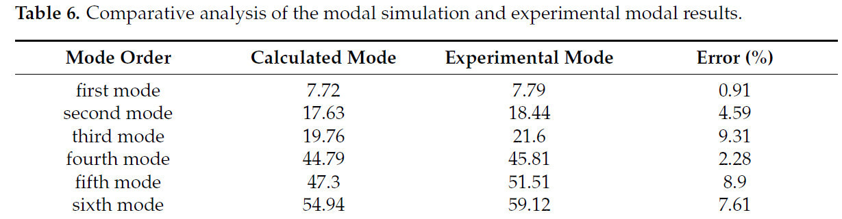 Таблица 6. Сравнительный анализ результатов модального моделирования и экспериментальных модальных результатов.