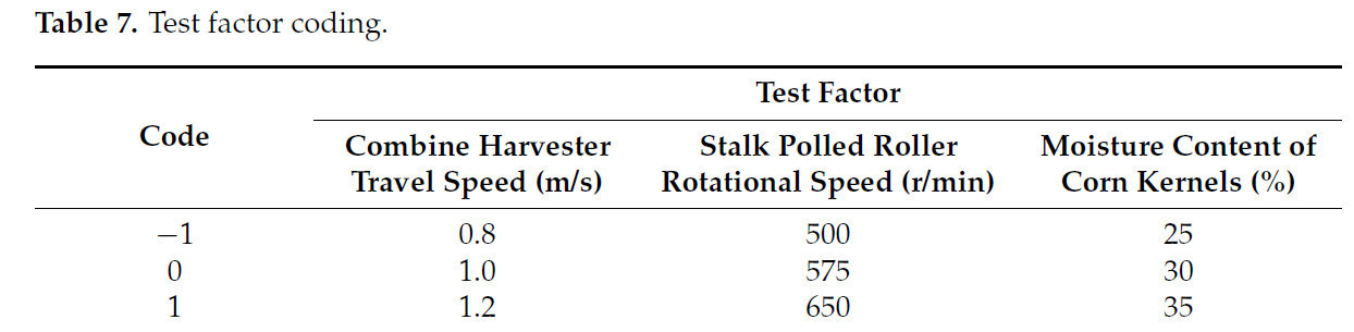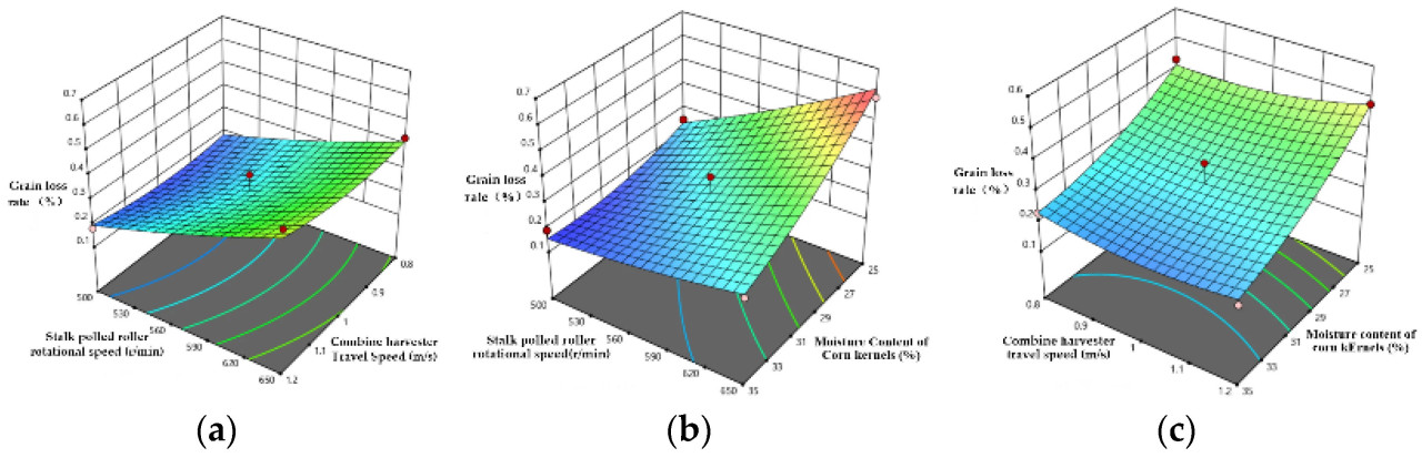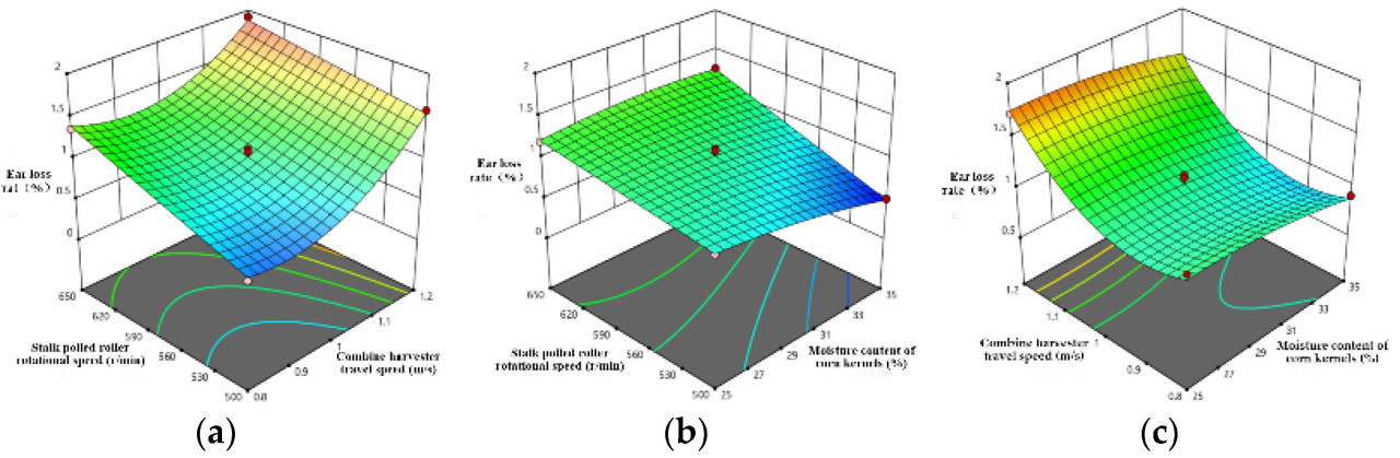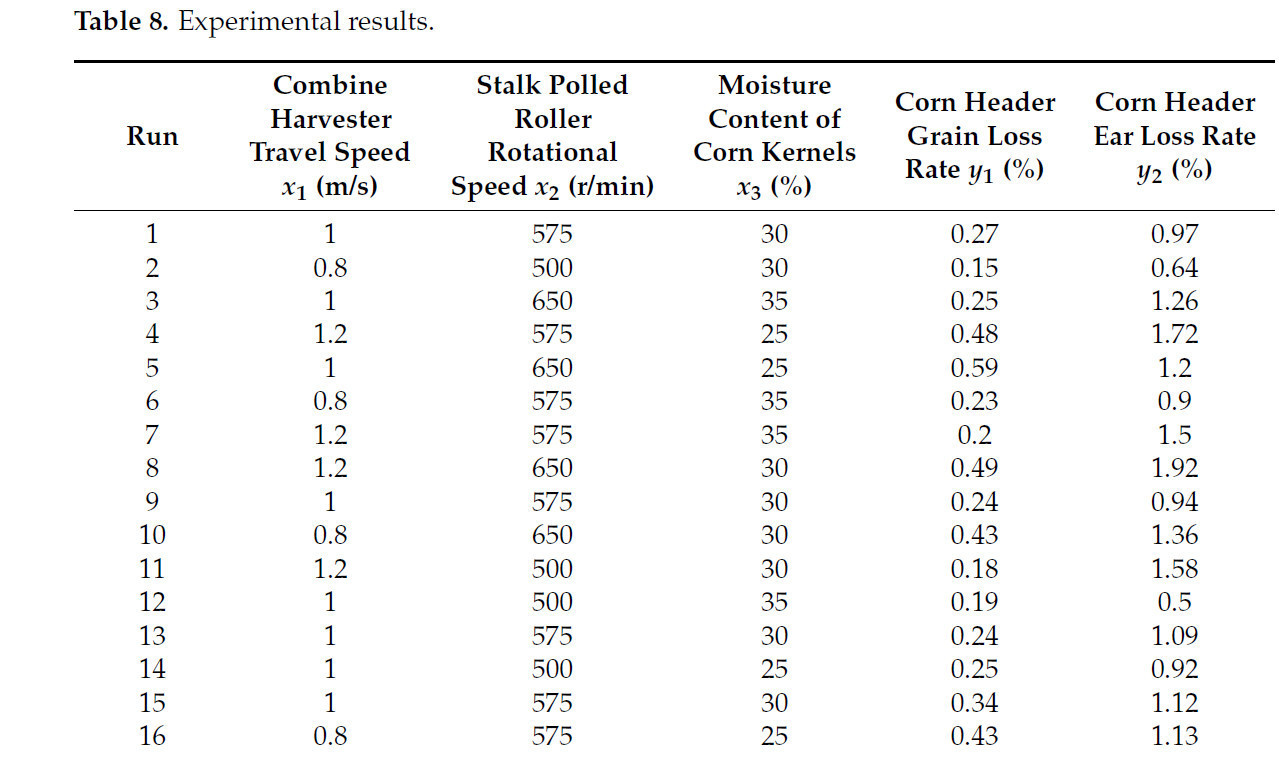 Существует три основных фактора [ 27 , 28 , 29 ], влияющих на эффективность уборки и комбайна: скорость комбайна, скорость катка и влажность зерна кукурузы. Как показано в таблице 7 , для проверки вышеуказанных факторов использовался метод экспериментального проектирования Бокса-Бенкена с использованием скорости потери початков кукурузы и скорости потери початков в качестве индикаторов, при этом влажность зерен кукурузы постоянно контролировалась, и эксперименты проводились, как только влажность зерен кукурузы соответствовала экспериментальным требованиям.