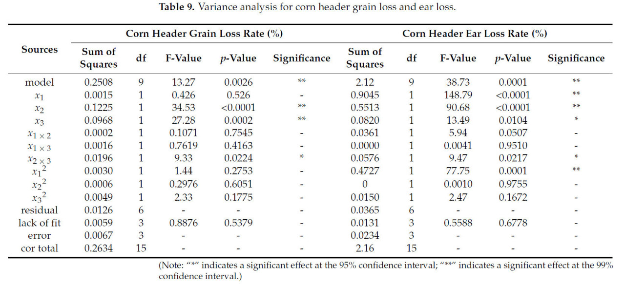 Данные в Таблице 8 были обработаны, и был проведен дисперсионный анализ как для потерь зерна в жатке кукурузы, так и для потерь колоса, как показано в Таблице 9 .