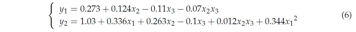 Был проведен множественный регрессионный анализ экспериментальных результатов, представленных в таблице 7, с целью установления уравнений регрессии для скорости потерь зерна в кукурузной жатке y1 и скорости потерь початков y2 в зависимости от скорости движения комбайна x1 , скорости вращения стеблеобрабатывающего ролика x2 и влажности зерен кукурузы x3 , как показано в уравнении ( 6 ) .