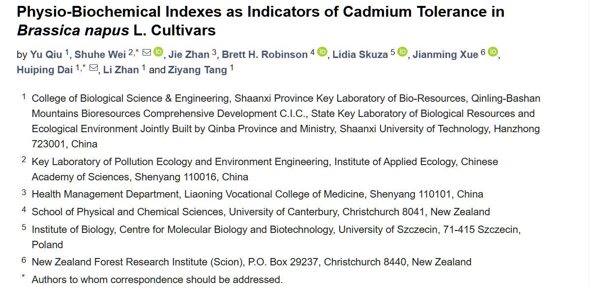 Qiu Y, Wei S, Zhan J, Robinson BH, Skuza L, Xue J, Dai H, Zhan L, Tang Z. Physio-Biochemical Indexes as Indicators of Cadmium Tolerance in Brassica napus L. Cultivars. Agriculture. 2025; 15(2):132. https://doi.org/10.3390/agriculture15020132
