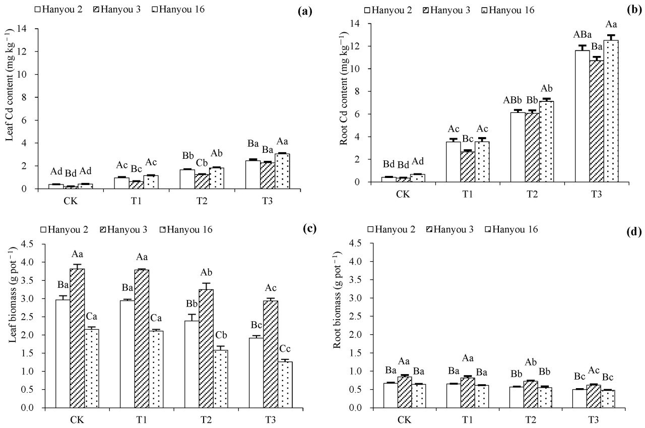 Биомасса листьев и корней трех изучаемых сортов B. napus в целом снижалась с увеличением концентрации Cd (от CK и T1 до T2 и T3) в почвах ( p < 0,05), как показано на рисунке 1 c, d. Биомасса листьев и корней в вариантах T2 и T3 была значительно ниже по сравнению с вариантом CK, тогда как в варианте T1 значительного снижения не наблюдалось ( p < 0,05). Были обнаружены значительные различия в биомассе листьев между сортами ( p < 0,05). Биомасса корней у сорта Hanyou 3 была значительно выше, чем у Hanyou 2 и Hanyou 16 ( p < 0,05). У сорта Hanyou 2 биомасса была выше, чем у Hanyou 16, а у Hanyou 3 в целом была самая высокая биомасса.