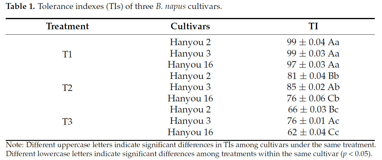 В таблице 1 представлены значения ИП трёх сортов B. napus . Как правило, ИП в вариантах T1 были самыми высокими и постепенно снижались от T2 к T3 ( p < 0,05). Различия в ИП между тремя сортами в варианте T1 были незначительными. Однако ИП сорта Hanyou 3 были, очевидно, самыми высокими в вариантах T2 и T3 (при этом Hanyou 2 находился посередине), что указывает на более высокую устойчивость сорта Hanyou 3 к кадмию.