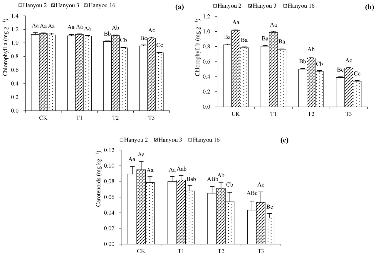 Рисунок 2. Хлорофилл a ( a ), хлорофилл b ( b ) и каротиноиды ( c ) трёх сортов B. napus . Различия в названиях столбцов разных сортов указывают на существенные различия, а различия в названиях строчных букв в разных вариантах обработки одного и того же сорта указывают на существенные различия при p < 0,05.