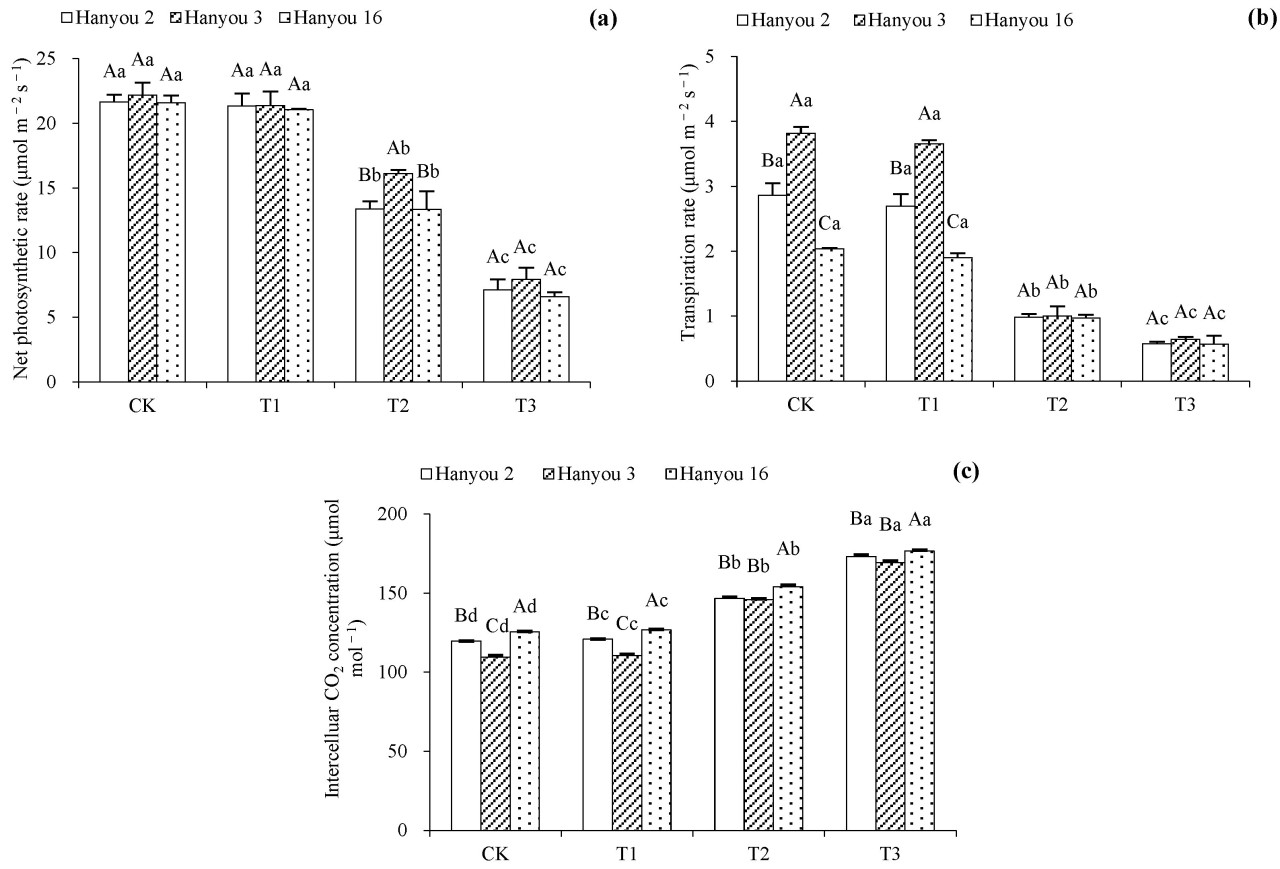 Скорость транспирации (Tr) имела аналогичную тенденцию к Pn ( рисунок 3b ). В варианте T1 не наблюдалось существенного снижения Tr по сравнению с вариантом CK, но выраженное снижение наблюдалось в вариантах T2 и T3 у всех трёх сортов ( p < 0,05). Tr сорта Hanyou 3 был самым высоким при вариантах CK и T1, тогда как существенных различий между тремя сортами при вариантах T2 и T3 не обнаружено ( p < 0,05).