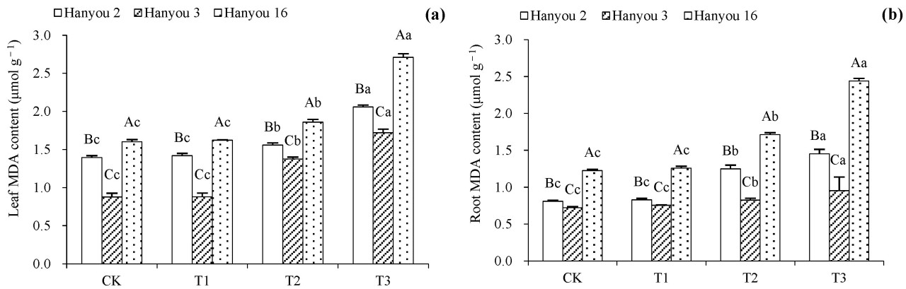 На рисунке 4 показано, что содержание МДА в листьях и корнях трёх сортов увеличивалось с ростом концентрации кадмия в почве. По сравнению с вариантом CK, содержание МДА в варианте T1 существенно не изменилось, тогда как в вариантах T2 и T3 наблюдалось значительное увеличение ( p < 0,05). Содержание МДА в сорте Hanyou 16 было самым высоким среди всех вариантов, а Hanyou 3 и Hanyou 2 заняли второе и третье места соответственно ( p < 0,05).