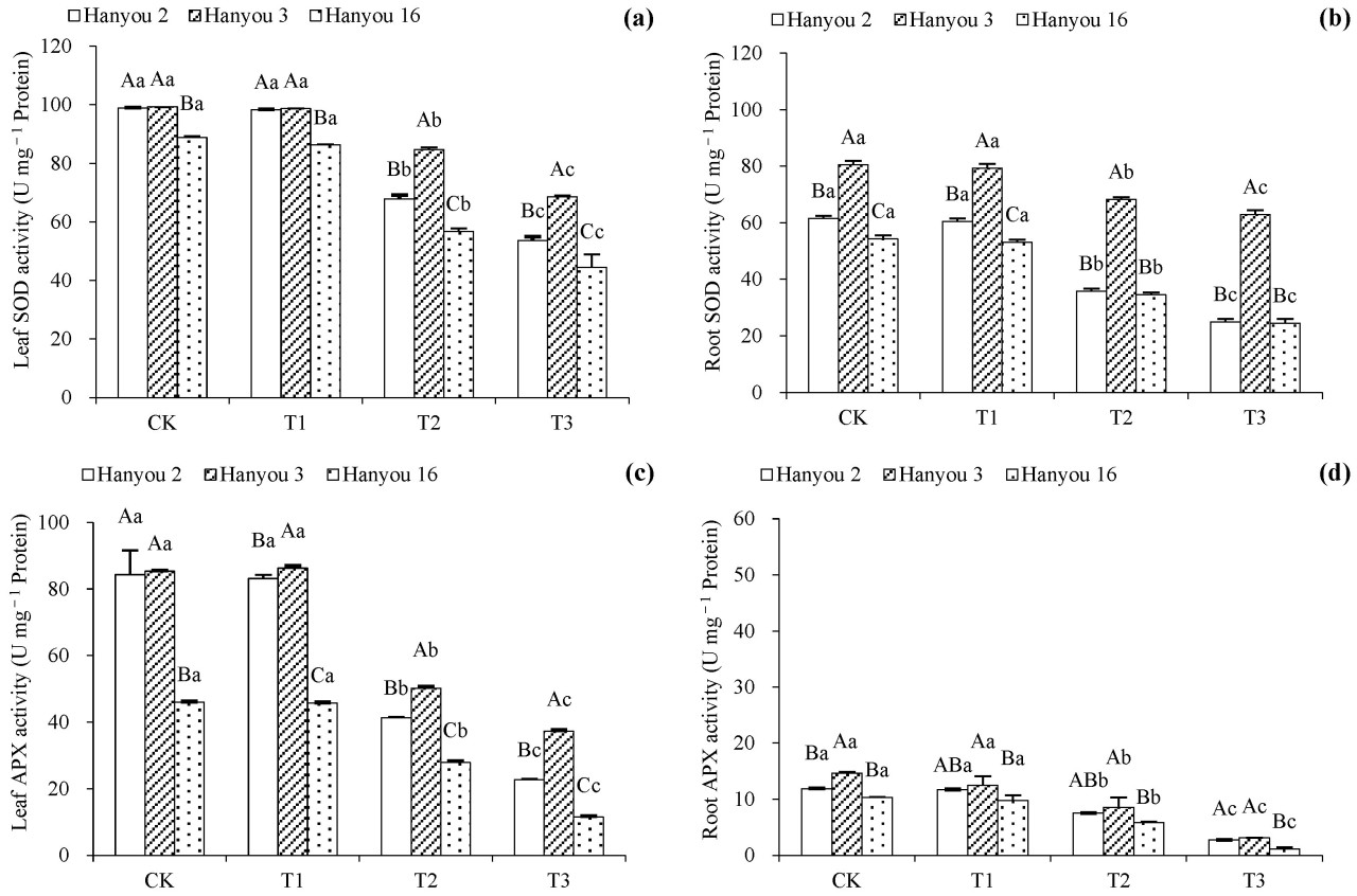 Активность СОД и АПКС в листьях и корнях трёх сортов следовала схожим тенденциям во всех вариантах обработки (CK, T1-T3; рисунок 5 ). По сравнению с обработкой CK, активность СОД и АПКС в листьях и корнях не была значительно снижена при обработке T1, но значительно снижена при обработке T2 и T3 ( p < 0,05). Среди сортов наибольшую активность СОД и АПКС как в листьях, так и в корнях продемонстрировал сорт Hanyou 3, за которым следовали Hanyou 2 и Hanyou 16 соответственно ( p < 0,05).