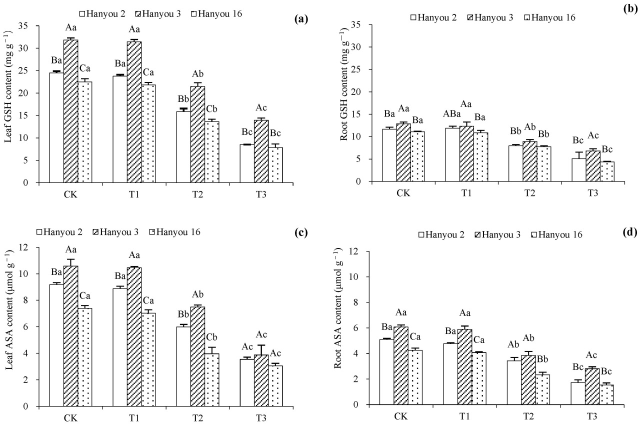 Содержание GSH и ASA в листьях и корнях трёх сортов ( Рисунок 6 ) показало схожие тенденции с активностью SOD и APX ( Рисунок 5 ). Существенных различий в содержании GSH и ASA между обработками CK и T1 не выявлено; однако эти маркеры были значительно снижены в T2 и T3 по сравнению с обработкой CK ( p < 0,05). Самые высокие уровни GSH и ASA были у сорта Hanyou 3, за ним следовали Hanyou 2 и Hanyou 16 ( p < 0,05).