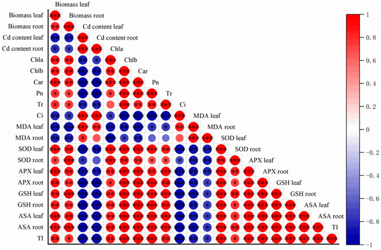 На рисунке 7 представлен корреляционный анализ Пирсона между индексом толерантности (TI), концентрацией кадмия, биомассой и физиологическими показателями трёх сортов во всех вариантах обработки. TI всех трёх сортов демонстрировал значимые положительные корреляции с показателями Chla, Chlb, Car, Tr, SOD, APX, GSH и ASA. Напротив, значимые отрицательные корреляции наблюдались с показателями Ci и MDA при p < 0,05, p < 0,01 или p < 0,001. Кроме того, TI значимым образом положительно коррелировал с биомассой листьев и корней ( p < 0,05 или p < 0,01 соответственно).