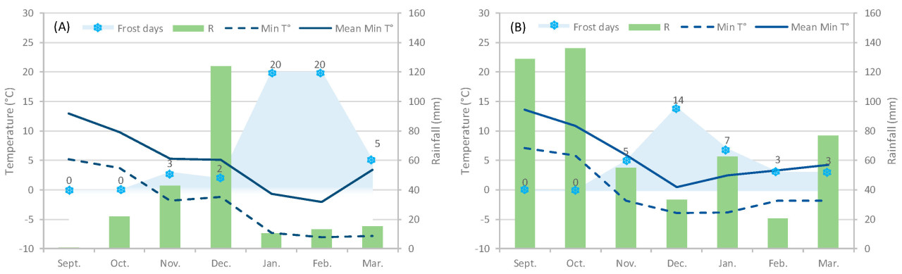 Рисунок 1. Метеорологические данные за вегетационные периоды 2022–2023 гг. ( A ) и 2023–2024 гг. ( B ). Морозные дни: дни в месяце, когда минимальная температура была ниже 0 °C; R: количество осадков; Min T°: минимальная температура; Mean Min T°: средняя минимальная температура.
