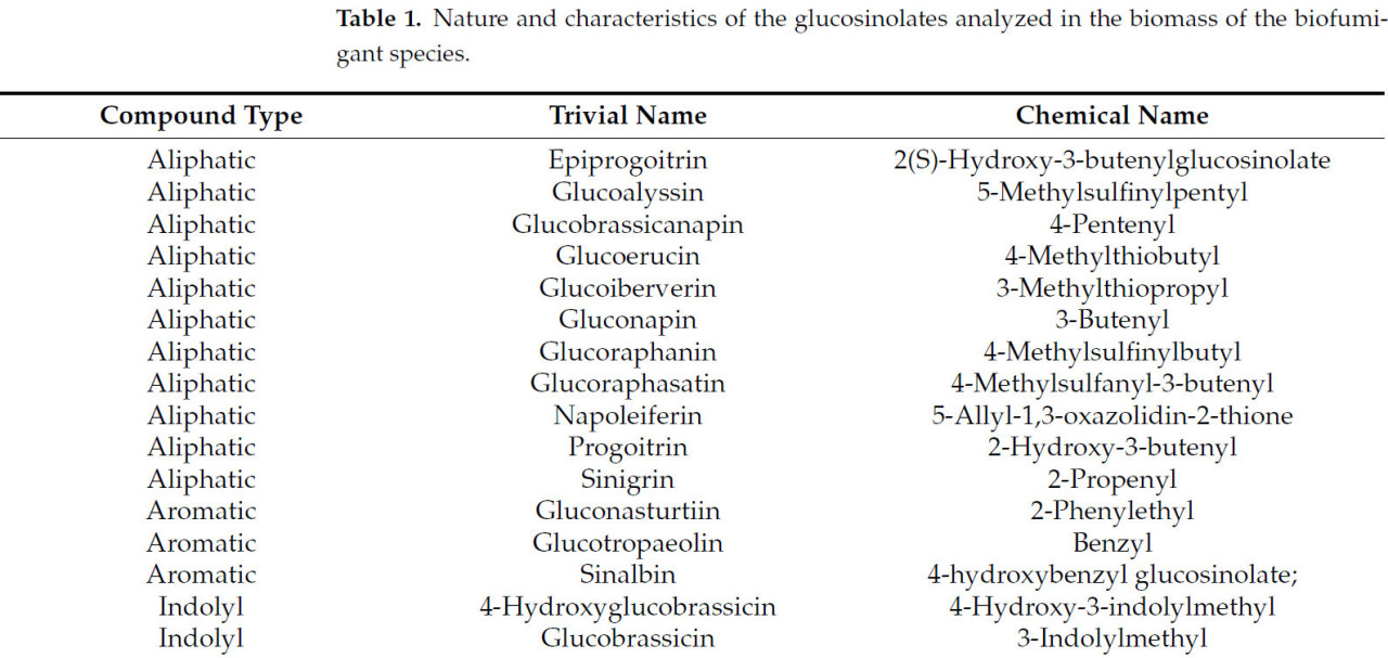 Таблица1. Природа и характеристики глюкозинолатов, проанализированных в биомассе видов биофумигантов.