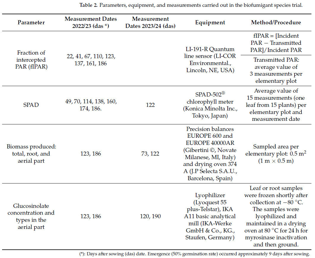 Эксперимент был разработан по рандомизированной схеме с четырьмя повторностями, при этом основным фактором был вид биофумиганта. Были включены четыре вида: Brassica carinata A.Braun (сорт Eleven), Brassica juncea L. (сорт Scala), Raphanus sativus L. (сорт Córdoba) и Sinapis alba L. (сорт Venice). Каждая элементарная делянка имела длину 10 м и ширину 3,6 м, общая площадь – 36 м² .