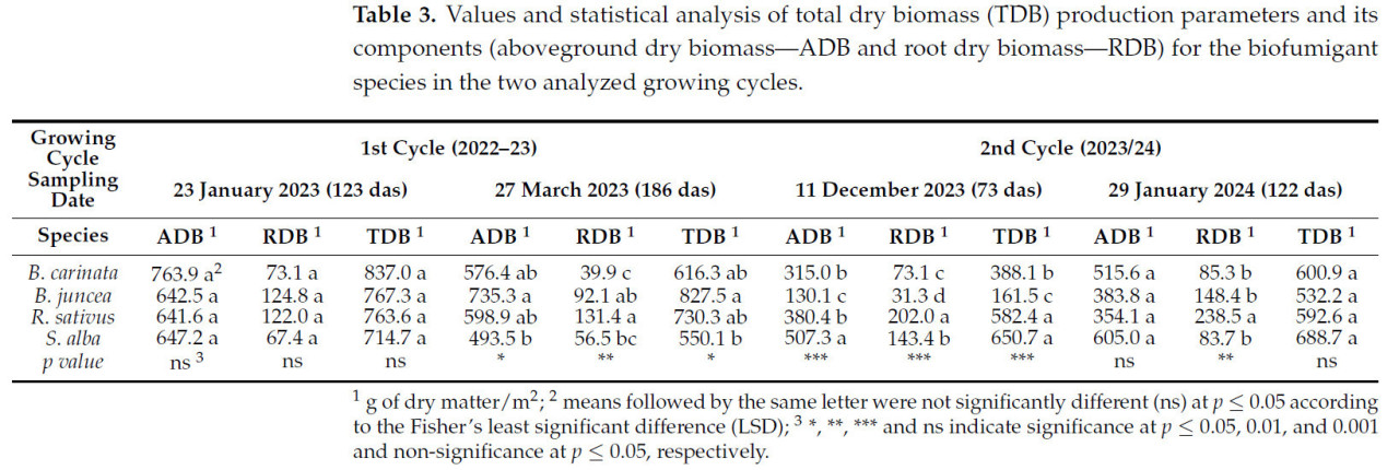 К концу января 2024 года, через 48 дней после предыдущего отбора проб (122 дас), четыре вида биофумиганта достигли очень близких значений TDB, что соответствует результатам, полученным при эквивалентном отборе проб из опыта осеннего посева 2022 года. Это связано с тем, что R. sativus и S. alba сохранили схожие уровни продуктивности с предыдущим отбором проб, практически не показав роста в этот период. Напротив, B. carinata и, особенно, B. juncea показали значительный рост TDB в это время, достигнув уровней, сопоставимых с двумя другими видами ( таблица 3 ). Что касается анализа двух компонентов (ADB и RDB), наиболее примечательным наблюдением является большее накопление корневой биомассы (RDB) у R. sativus по сравнению с другими тремя видами.