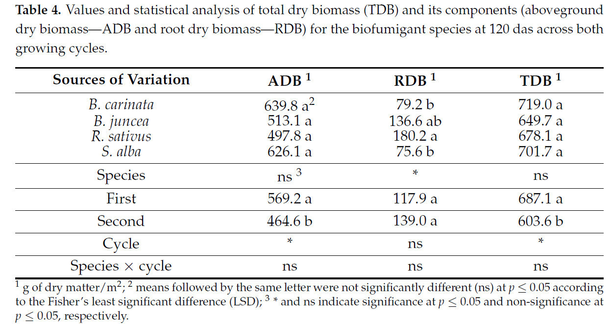 Таблица 4. Значения и статистический анализ общей сухой биомассы (TDB) и ее компонентов (надземная сухая биомасса — ADB и корневая сухая биомасса — RDB) для видов биофумиганта при 120 дас в обоих циклах выращивания.