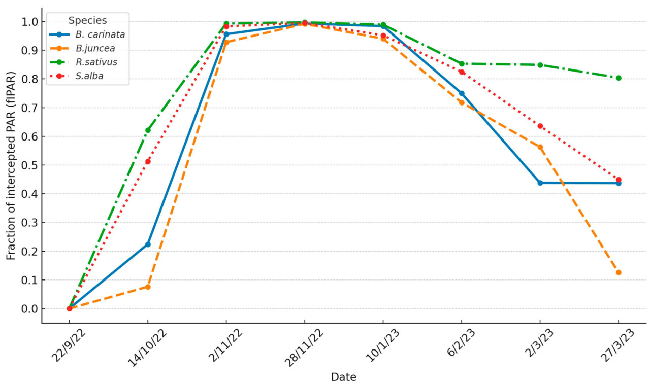 По мере развития цикла эти первоначальные различия между видами постепенно уменьшались. К началу ноября 2022 года (41 дас) только B. juncea показала более низкие уровни перехвата PAR по сравнению с другими видами, у которых значения fIPAR уже превысили 0,95. К концу ноября 2022 года (67 дас) ( рис. 2 ) значения fIPAR приблизились к 1 (между 0,99 и 1) у всех четырёх видов.