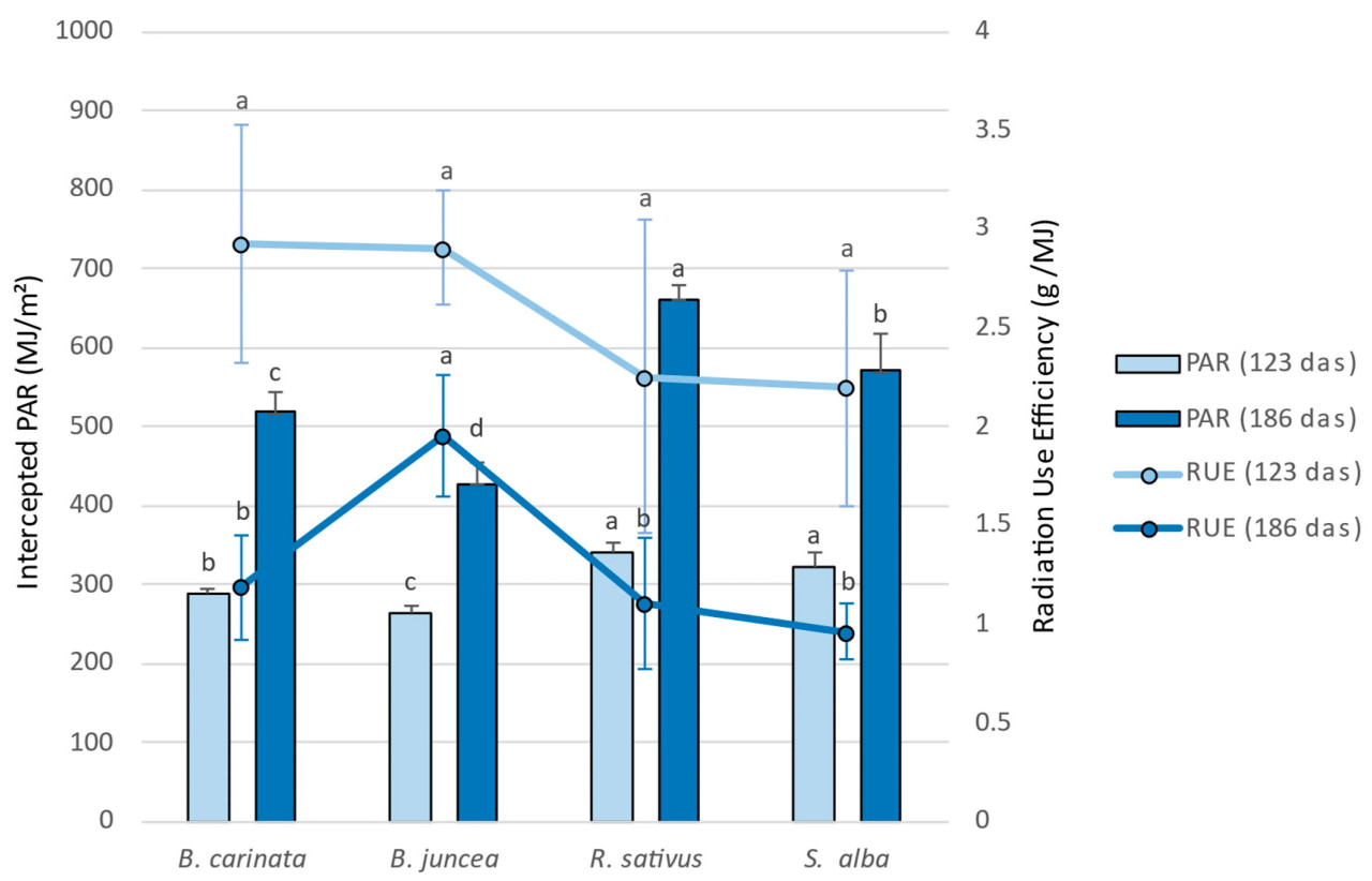 Интегрированный эффект эволюции fIPAR отразился в общих значениях PAR, перехваченных каждым из видов биофумиганта с момента посева до каждой из двух дат отбора проб биомассы (123 и 186 дас) ( Рисунок 4 ).