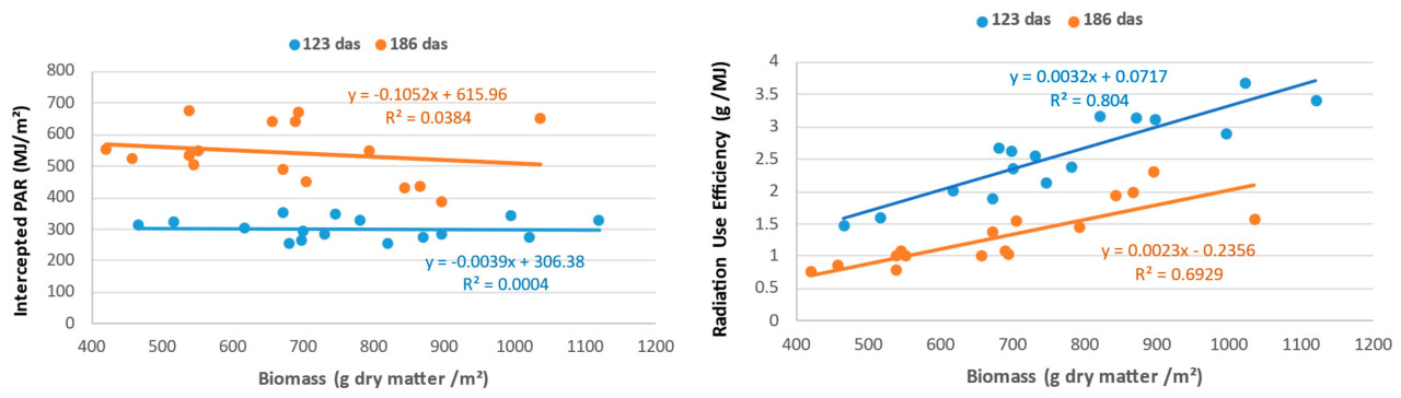 Кроме того, при анализе корреляций между накопленной биомассой и двумя факторами, которые ее определяют (перехваченный PAR и RUE), в обеих выборках (123 и 186 das) очевидно, что связь между биомассой и RUE намного сильнее, чем между биомассой и перехваченным PAR ( Рисунок 5 ).