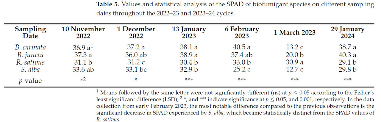 Наконец, в начале марта 2023 года, после длительного периода низких температур, различия в значениях SPAD между видами биофумигантов стали значительно более выраженными. Это было связано с резким снижением значений SPAD, наблюдавшимся у B. carinata , B. juncea и S. alba , чего не наблюдалось у R. sativus , у которого значения SPAD либо сохранились, либо лишь незначительно снизились по сравнению с предыдущими измерениями. В результате, к тому времени четыре вида биофумигантов были сгруппированы в три отдельных уровня с весьма значительными различиями между ними.